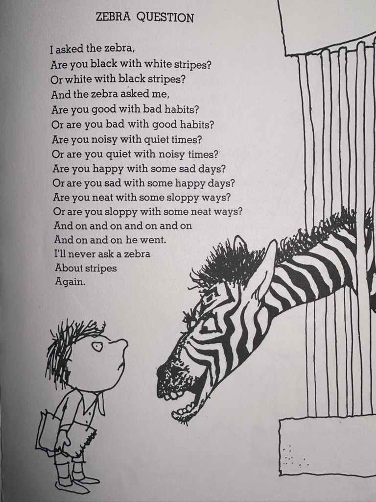 We also enjoy reading Shel Silverstein to the kids. At one point, they latched on to a very particular poem. Was it because of the compelling way I voiced the zebra? I'd like to think so, but there's also something sonically pleasing about the couplet repetition throughout the poem.