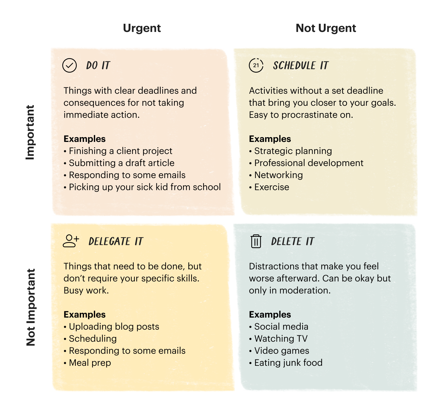 The Eisenhower Matrix is a useful framing tool. One of the insights gleaned from working through this matrix is that tasks that are important but not urgent (think things like eating healthily or exercising) can become urgent without warning (think medical emergency caused by not eating healthily and exercising). If we neglect the important things like taking care of ourselves simply because those things don't seem urgent, we are setting ourselves up for failure.